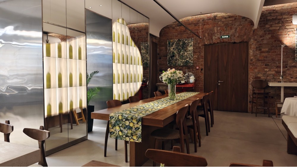 Интерьер как помню: сделанное хорошо не требует ремонта долго. И повторяться нет смысла. Пугают два момента. Офис посередине зала. Не просто ноут, а скарб, книги, ежедневники, канцелярские товары. В ресторане в 20.00. Второе — свет. Я помнил, что он разный, но всего два стола из двадцати вижу с правильно работающими «точками». Потолочными и на высоких светильниках. Остальные места для гостей мрачны и только портят еду. В остальном лепота. Диваны, но комфортные, с подушками, ужинаюший поп-ап-шеф, опрятный открытый бар — центр всего тут.