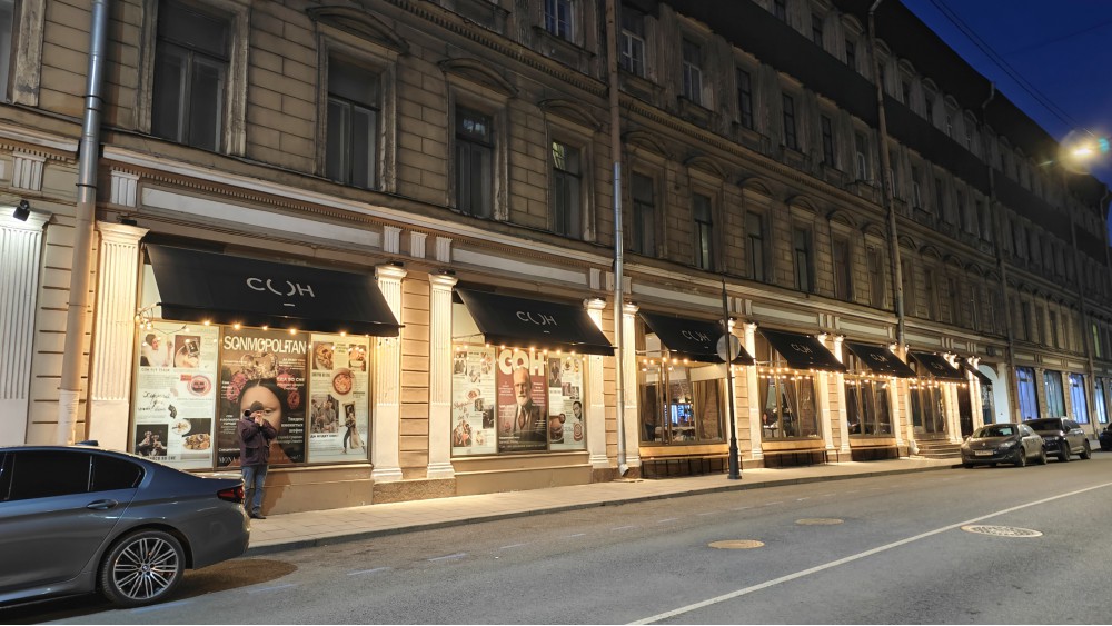 Кажется, с запуска в 2022-м (https://allcafe.ru/reviews/kolonka-restorannogo-kritika/restorannyy-kritik-vidit-son/) эти маркизы со словом «Сон» русскими буквами, но освещены лишь... городским фонарём. Телефон привычно вытянул, высветил на фото, но не сказать, что ярки эти буквы. Да, повторенные десяток раз, незаметными не назвать, но... Под ними череда лампочек — правильно, это графично, даже красив, но контрастно, и слова «Сон» работают меньше. Люди могут не специально искать ресторан, но проходить мимо — «Адмиралтейская» же, центр, должны запомнить и уже потом, встретив в сетях, сопоставить. Разумеется, всё сказанное относится к тёмной половине года. А в остальном — нравится. Не уродует Великий Город — у меня даже лет десять была такая номинация в Итогах Года. Про Уважение. Личное мнение, сугубо субъективное: летом — отличный вариант, а в тёмные петербургские полгода я бы как-то иначе переформатировал. Ну и скамейки в ряд по фасаду — для горожан, а не замена веранды, с прикрученными столиками «только для гостей»: наше уважение за уважение людям.
