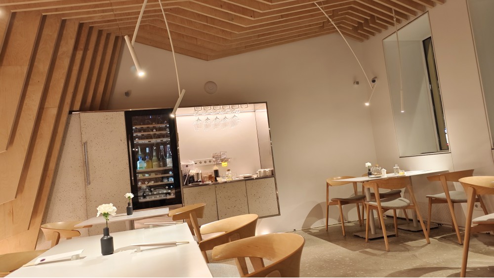 Пятница, вечер — посмотрим жизнь в динамике и запаре. По встрече, по первому контакту, впечатления... совсем не звёздного места. Гардероб без номера, зато с поисками. Светильники смонтировали, но направили не на столы, а на полы: половина столов в двух залах — одинаково, равно, в диком шахматном порядке — с хирургическим светом, а на второй половине нельзя (мне) читать меню. Но нельзя на хорошие, со строгим «Только двойки»: в пятницу вечером пять столов занято, шесть свободны. Я не против «двоек», проблема в удобстве эти мест. Меня мучили худшим столом, в проходе и у официантской станции: в двадцати сантиметрах от уха терминал рабочий, общение, отпуск дюжины пакетов за время визита, и не только персонал, но и люди-гости вокруг, тушки в куртках ходят, спрашивают еду с собой... Ломается ресторан как предприятие, как род деятельности. Повторю, фиговое место фигово не капризами, а десятком пакетов «Ультима», что перед носом пронесли: вроде в ресторане сидишь, а как в кладовке технической, но платишь как в ресторане. К 20.30 вообще остался один стол в зале, и я тогда не понял, зачем меня мучили, ограничивали так жестоко, ради чего портить впечатление на весь ужин? Надо описывать брюшко тунца, а запоминаешь только это, а не...