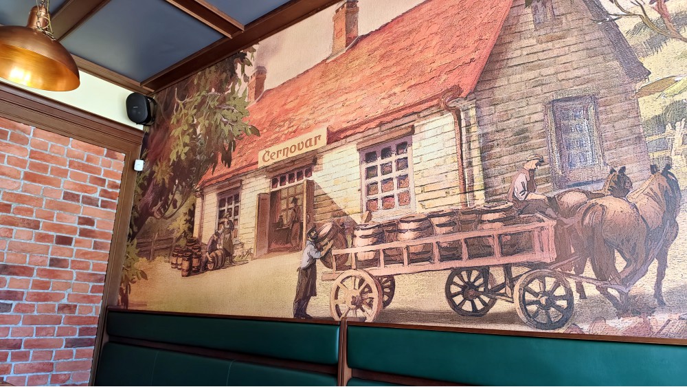 Интерьер свежий, как вчера открылись, а ведь уже много лет, судя по следу в сети… Не сильно душевный, местами даже формален свежестью, похож на сотню других «деревянных» — надо его лапками подстарить, сделать чуть классической пивной или пабом, а не леруамерленом. Диваны кожзамовые в нескольких купе очень широкие, метр до спинки, таких 9/10 мест, или высокие сидения «Болтай ножками» перед баром. Подушки куцые, на три сантиметра, не в помощь. Сел в небольшом зале на два стола, где есть целых четыре стула. Хорошо, что это был уже запасной вариант — мог и не остаться с такими лежанками. Второй раз отправился смотреть, как смотрится весь антураж без солнца: в понедельник вечером занято больше половины заведения — успех! И вот тут оказалось, что есть основной зал на десяток столов. Неровных освещением, тоже с диванами по стенкам, шире плацкартных и без подушек в этом зале. Устроился, конечно, нормально, но удивляюсь — не тому, что построили, а что людям надо...