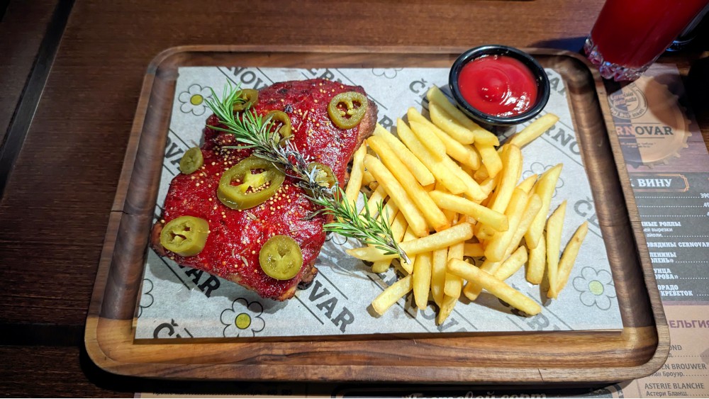 Три меню: гость в удивлении. Сезонное не представили, на второй день вообще забыли отдать, и повтор части на плейсмате блюд в тетради: где читать, они одинаковые или нет? Цены разные. Местами пугают: томлёное ребро бычка или рубленый бифштекс — по 1500. А какие-то, наоборот, ласково мурлычат: севиче из дорадо и тигровых креветок за 760 (надеюсь, это чешское севиче), бельгийские мидии за 820, а не 1200, хлебная корзинка за 80, а не 380, как уже привычно, а все десерты по 450. Да, плохо, что даже условно чешских позиций менее пятой части, всё же такое меню мог видеть в любом пивном заведении. И том ям ещё… Цены на пенное крепкие: ОТ 500 за 0.25/0.3, это чешские сорта тоже, а пол-литра — 600-770. Но фирменная посуда под редкий бельгийский сорт, пусть без бирдекеля: пивная культура или не пивная культура? Сто лет не видел слов «вода импортная» в карте (280), или неплохой морс 170, или чай 420.