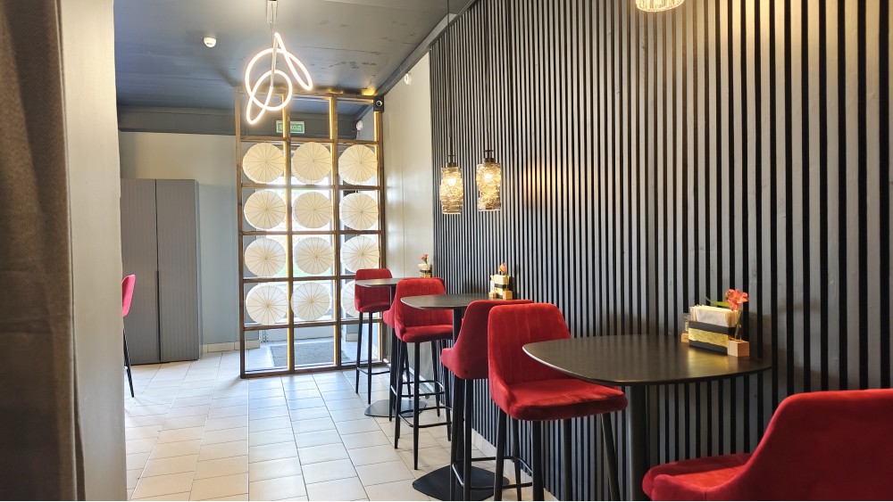 Интерьер: я бы назвал его «суши-бар на 99%». Всё красное тонами, всё непонятное, всё довольно изящное, женственное, неброское, но и нескучное. Запомню, по фото, может, и отличу, тем более помещение с одним окном, не самое большое. Отчаянно хвалю за диваны: на вид даже понятно, что плотные, упругие, короткие, удобные. Зачёт, пусть и мне всё время шептали стены и столы про суши. Что же такое, ведь их нет в меню, довольно компактном.
